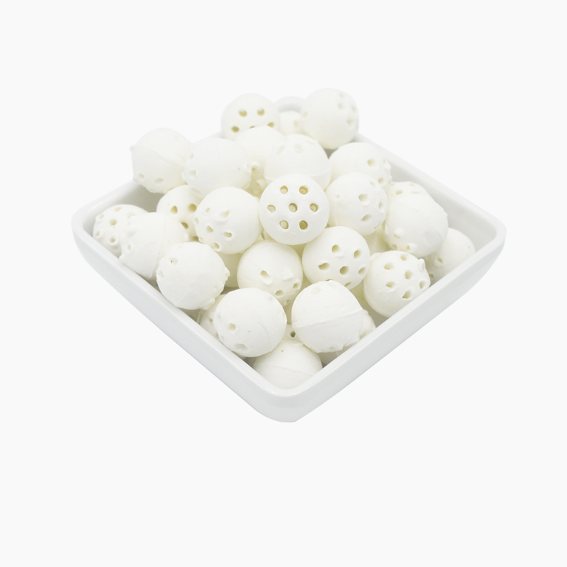 開孔瓷球外觀為白色球體,開孔互相垂直,開孔數(shù)量可以根據(jù)實際使用需要和瓷球的尺寸大小開單孔、三孔、五孔及七孔。