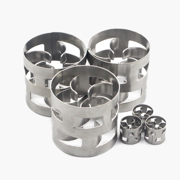 金屬鮑爾環(huán)填料是采用金屬薄板沖制而成,在環(huán)壁上開出了兩排帶有內(nèi)伸舌葉的窗孔。每排窗孔有五個舌葉,每個舌葉彎向環(huán)內(nèi),指向環(huán)心,在中心處幾乎相搭,上下兩層窗孔的位置相互錯開,一般開孔的總面積約為整個環(huán)壁面積的35%左右,由于鮑爾環(huán)填料在環(huán)壁上開了許多窗孔,使得塔內(nèi)的氣體和液體能夠從窗口自由通過,目前鮑爾環(huán)填料是被采用的主要環(huán)形填料之一。