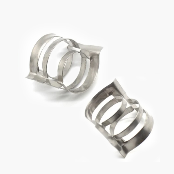 金屬共軛環(huán)填料揉合了環(huán)形和鞍形填料的優(yōu)點,采用共軛曲線肋片相結(jié)構(gòu),兩端外卷邊及合適的長徑比、填料間或填料于踏壁間均為點接觸,不會產(chǎn)生疊套、孔隙均勻、阻力小、亂堆時取定向排列,故有規(guī)整填料的特點,有較好的流體力學(xué)和傳質(zhì)性能。