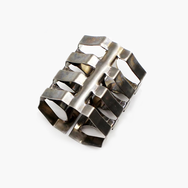 金屬八四內(nèi)弧環(huán)填料,也稱麥勒環(huán)填料,是一種新型高效金屬散堆填料,該填料有合理的幾何對(duì)稱性,構(gòu)造均勻性好及高的空隙率,八弧卷與四弧圈順軸向交替安排,名弧段沿徑向環(huán)內(nèi)折進(jìn),從而使填料表面連續(xù)而不斷開,且在空間均勻分布,與鮑爾環(huán)相比,通量可提高15-30%,壓降減小20-30%。